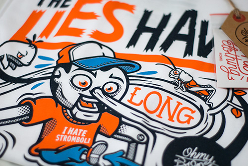 Questo è forse l’aspetto più importante di tutto il processo produttivo che c’è dietro le t-shirt Ohmyboot. Volevo che tutto fosse fatto in Italia ma soprattutto volevo che venisse fuori anche l’artigianalità e la qualità di stampa. Tutte le t-shirt sono stampate in serigrafia – secondo me rimane una delle tecniche di stampa più affascinanti – e l’unica paura era quella di non riuscire a ottenere il risultato sperato a causa dei numerosi dettagli e dell’elevato numero di colori che compongono le grafiche. Avevo bisogno di trovare qualcuno che avesse l’esperienza e la pazienza tale da consentirmi di seguire da vicino la produzione, in questo sono un po’ fissato. Fortunatamente l’incontro con Creative Lab Serigrafia è stato provvidenziale. Matteo si è dimostrato da subito disponibile e interessato alla buona riuscita del progetto. Da qui in poi, oltre alla soddisfazione per l’ottimo risultato ottenuto, è anche nata una bella collaborazione. Di solito, ci divertiamo ad organizzare dei Liveprinting estemporanei che riscuotono anche un discreto successo.