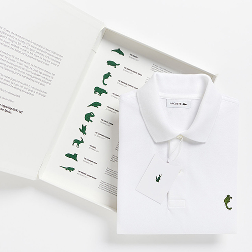 Dopo la collaborazione del 2009 con i fratelli Campana e dopo aver personalizzato il coccodrillo con i colori della bandiera francese in occasione delle olimpiadi di Sochi 2014, Rio 2016 e PyeongChang 2018, la nuova iniziativa di Lacoste è una serie a tiratura limitata di polo, curata dal designer Felipe Oliveira Baptista e realizzata per supportare SOS Save Our Species e il programma dell’International Union for Conservation of Nature (IUCN).